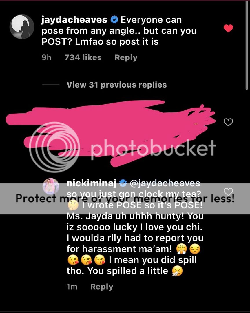 Nicki responded, “@jaydacheaves so you just gon clock my tea? I wrote POSE so it’s POSE! Ms. Jayda uh uhh hunty! You iz soooo lucky I love you chi. I woulda rlly had to report you for harassment ma’am! I mean you did spill tho. You spilled a little.”